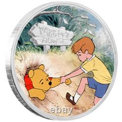 1 Oz Silver - Proof - in Color. Third issue from the "Winnie the Pooh" Series. Mintage only 3,000 pieces. This silver coin struck by the New Zealand Mint is the third issue of the "Winnie the Pooh" series. The motive in color shows the moment when Christopher Robin attempts to pull his friend Winnie the Pooh out of Rabbit's house.