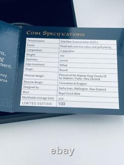 The obverse features a portrait of King Charles III and'Middle-earth' setting these coins apart from other New Zealand commemoratives. Denomination: One New Zealand dollar Finish: Proof with Selective Colour and gold plating Composition: 0.999 Silver Weight: 2 oz Diameter:50 mm Edge treatment: Milled Obverse design: Portrait of His Majesty King Charles III, by Stephen Fuller, New Zealand Shape: Round Reverse design: Coronation of Aragorn Designed by: Sacha Lees, Wellington NZ Worldwide mintage limit: 300 Mint: Royal Dutch Mint.