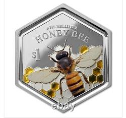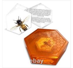 Dans le processus de fabrication du miel, les abeilles ouvrières construisent une structure de cellules en nid d'abeille où le nectar et le pollen sont stockés, et où les larves se développent. L'abeille est mise en valeur sur la pièce par une gravure tridimensionnelle et une impression en couleur. Elle est représentée assise sur le nid d'abeille, qui a été partiellement rempli de résine translucide de couleur ambre - reproduisant du vrai miel !