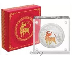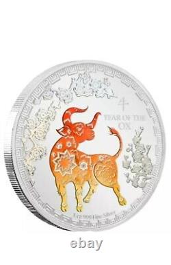 2021 Nouvelle-Zélande Année Lunaire du Bœuf 1 oz Argent Épreuve COLORISÉE. Ces OGP ont été achetés en 2021 et ont été conservés dans un coffre-fort - jamais envoyés pour certification. Années Lunaires du Bœuf : 1913, 1925, 1937, 1949, 1961, 1973, 1985, 1997, 2009, 2021. Cette pièce de monnaie en argent 1 oz de l'Année Lunaire du Bœuf montre un puissant bœuf dans des couleurs flamboyantes adoucies par des motifs décoratifs. L'arrière-plan poli intègre des branches gravées remplies de fleurs de cerisier et une bordure ornementale.